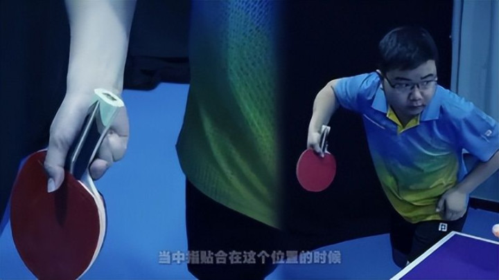 中指在发球过程中也起到了关键作用。它贴合在拍柄的侧沿,起到控制球拍发力制动的作用。当球拍甩动时,中指下压一下,可以制动拍型,防止甩动幅度过大,使力量更好地作用到球上。