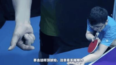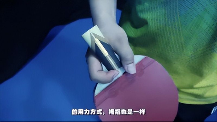 中指在发球时要用力顶住球拍,用指尖去感受顶住球拍发力的感觉。同时,食指的第二指关节要扣住轻压球拍,拇指也要做一个轻压的动作。三个手指在一起配合起来,整个发力才会更加协调。